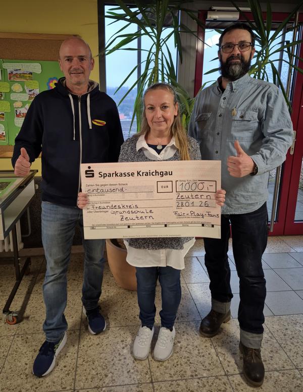 Herr Zimmerer von den Fair-Play-Fans-Baden übergab am 28.01.2026 dem Freundeskreis der Grundschule Zeutern, vertreten durch den ersten Vorsitzenden Herrn Siegele, eine Spende in Höhe von 1.000 Euro. Der Betrag kam im Rahmen der Tannenbaumaktion vom 09.01.2026 zusammen, die in der Gemeinde Zeutern großen Zuspruch fand.
